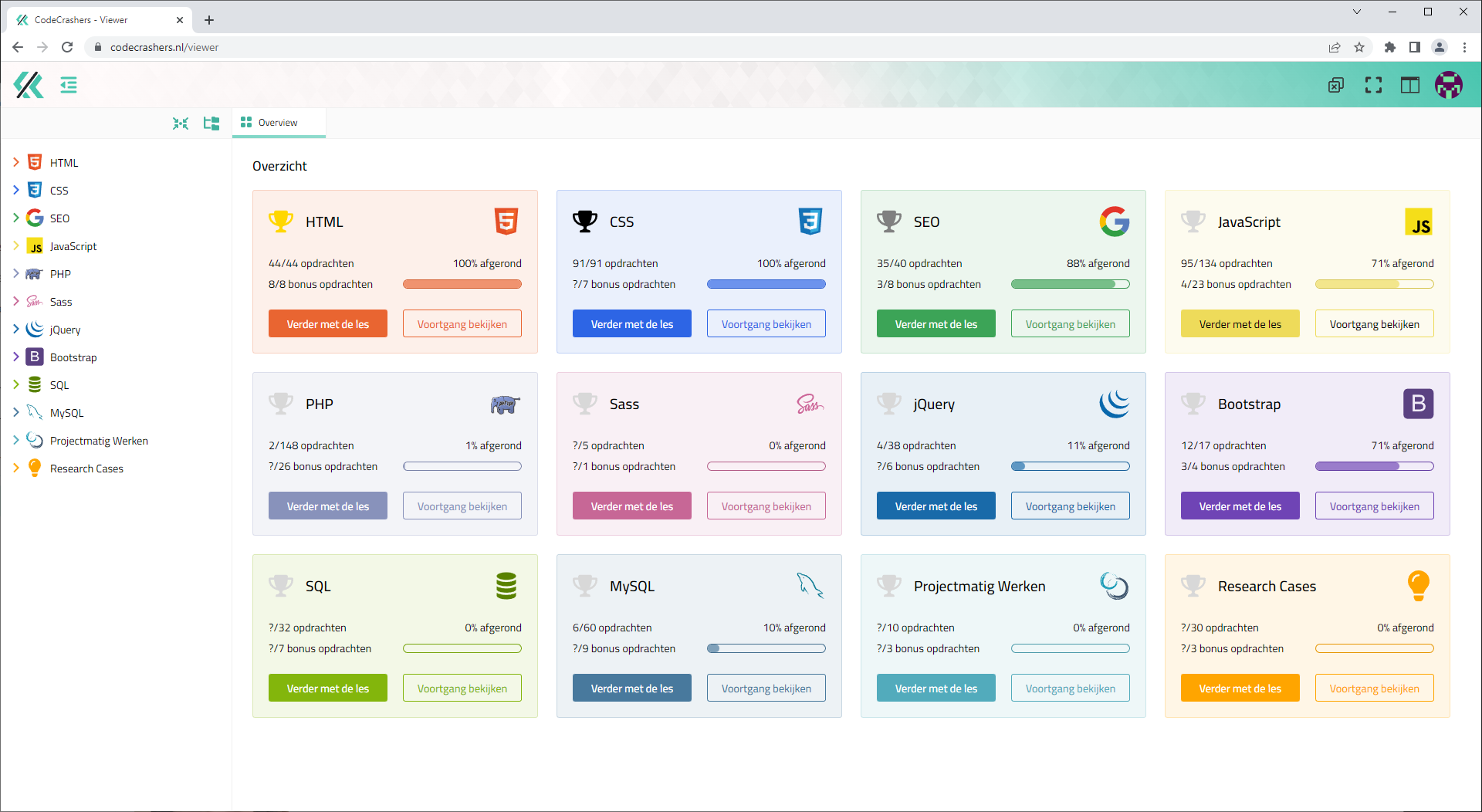 Onze leeromgeving wordt geleverd met een beheerpaneel waarin enerzijds studenten hun eigen voortgang kunnen tracken en anderzijds docenten de voortgang van hun studenten kunnen volgen, beoordelen en beheren.